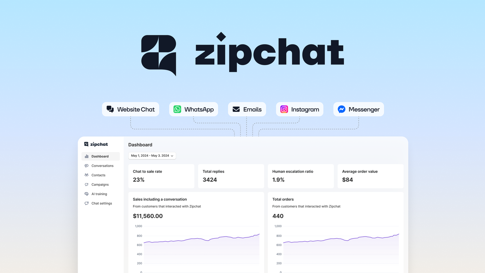 - Déployez un agent IA sur le chat du site web, l’email, WhatsApp, Instagram et les messages directs Messenger